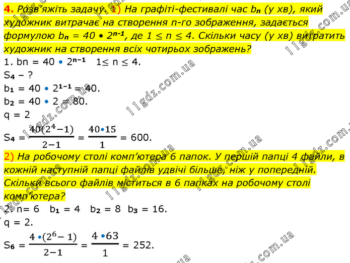 Розв’яжіть задачу. 1) На графіті-фестивалі час bn (y хв), який художник витрачає на створення n-го зображення, задається формулою bn = 40 • 2n-1, де 1 ≤ n ≤ 4. Скільки часу (у хв) витратить художник на створення всіх чотирьох зображень? 1. bn = 40 • 2n–1 1≤ n ≤ 4. S4 – ? b1 = 40 • 21–1 = 40. b2 = 40 • 2 = 80. q = 2 S4 = (40(2^4-1))/(2-1) = (40•15)/1 = 600. 2) На робочому столі комп’ютера 6 папок. У першій папці 4 файли, в кожній наступній папці файлів удвічі більше, ніж у попередній. Скільки всього файлів міститься в 6 папках на робочому столі комп’ютера? 2. n= 6 b1 = 4 b2 = 8 b3 = 16. q = 2. S6 = (4 •(2^6- 1))/(2-1) = (4 •63)/1 = 252.