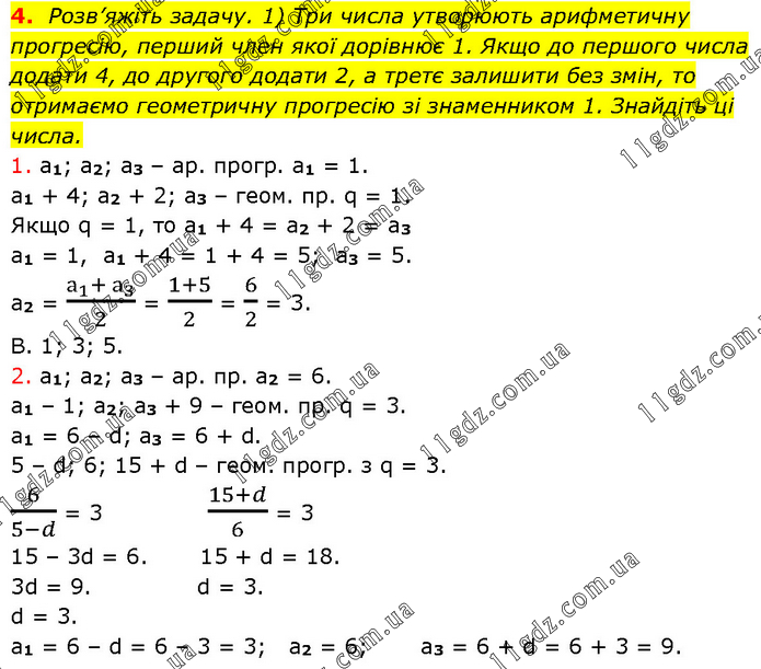 Розв’яжіть задачу. 1) Три числа утворюють арифметичну прогресію, перший член якої дорівнює 1. Якщо до першого числа додати 4, до другого додати 2, а третє залишити без змін, то отримаємо геометричну прогресію зі знаменником 1. Знайдіть ці числа. 1. а1; а2; а3 – ар. прогр. а1 = 1. а1 + 4; а2 + 2; а3 – геом. пр. q = 1. Якщо q = 1, то а1 + 4 = а2 + 2 = а3 а1 = 1, а1 + 4 = 1 + 4 = 5; а3 = 5. а2 = (а_1+ а_3)/2 = (1+5)/2 = 6/2 = 3. В. 1; 3; 5. 2. а1; а2; а3 – ар. пр. а2 = 6. а1 – 1; а2; а3 + 9 – геом. пр. q = 3. а1 = 6 – d; a3 = 6 + d. 5 – d; 6; 15 + d – геом. прогр. з q = 3. 6/(5-d) = 3 (15+d)/6 = 3 15 – 3d = 6. 15 + d = 18. 3d = 9. d = 3. d = 3. a1 = 6 – d = 6 – 3 = 3; a2 = 6; a3 = 6 + d = 6 + 3 = 9.