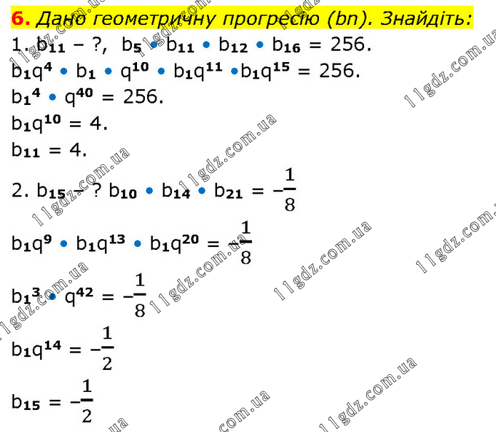 Дано геометричну прогресію (bn). Знайдіть: 1. b11 – ?, b5 • b11 • b12 • b16 = 256. b1q4 • b1 • q10 • b1q11 •b1q15 = 256. b14 • q40 = 256. b1q10 = 4. b11 = 4. 2. b15 – ? b10 • b14 • b21 = –1/8 b1q9 • b1q13 • b1q20 = –1/8 b13 • q42 = –1/8 b1q14 = –1/2 b15 = –1/2