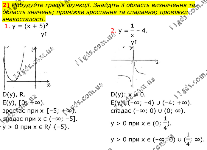 2) Побудуйте графік функції. Знайдіть її область визначення та область значень; проміжки зростання та спадання; проміжки знакосталості. 1. у = (х + 5)2 у↑ 2. у = 1/х – 4. у↑ D(y), R. E(y), [0; +∞). зростає при х [–5; +∞). спадає при х ∈ (–∞; –5]. y > 0 при х ∈ R/ {–5}. D(y): x ≠ 0. E(y): (–∞; –4) ∪ (–4; +∞). спадає (–∞; 0) ∪ (0; ∞). y > 0 при х ∈ (0; 1/4). y > 0 при х ∈ (–∞; 0) ∪ (1/4; ∞).