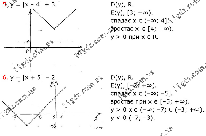 5. y = |x – 4| + 3. D(y), R. E(y), [3; +∞). спадає х ∈ (–∞; 4]. зростає х ∈ [4; +∞). y > 0 при х ∈ R. 6. y = |x + 5| – 2 D(y), R. E(y), [–2; +∞). спадає х ∈ (–∞; –5]. зростає при х ∈ [–5; +∞). y > 0 х ∈ (–∞; –7) ∪ (–3; +∞). y < 0 (–7; –3).