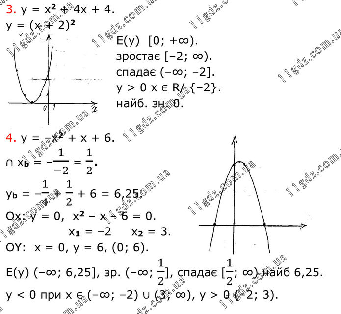 3. у = х2 + 4х + 4. у = (х + 2)2 Е(у) [0; +∞). зростає [–2; ∞). спадає (–∞; –2]. y > 0 x ∈ R/ {–2}. найб. зн. 0. 4. y = –x2 + x + 6. ∩ xb = –1/(-2) = 1/2. yb = –1/4 + 1/2 + 6 = 6,25. Ox: y = 0, x2 – x – 6 = 0. x1 = –2 x2 = 3. OY: x = 0, y = 6, (0; 6). E(y) (–∞; 6,25], зр. (–∞; 1/2], спадає [1/2; ∞) найб 6,25. у < 0 при х ∈ (–∞; –2) ∪ (3; ∞), y > 0 (–2; 3).