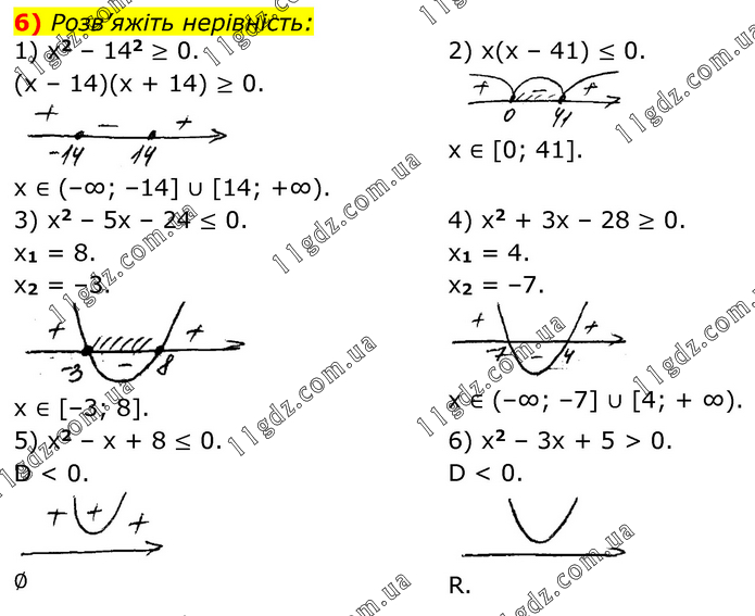 6) Розв’яжіть нерівність: 1) x2 – 142 ≥ 0. (x – 14)(x + 14) ≥ 0. x ∈ (–∞; –14] ∪ [14; +∞). 2) x(x – 41) ≤ 0. x ∈ [0; 41]. 3) x2 – 5x – 24 ≤ 0. x1 = 8. x2 = –3. x ∈ [–3; 8]. 4) x2 + 3x – 28 ≥ 0. x1 = 4. x2 = –7. x ∈ (–∞; –7] ∪ [4; + ∞). 5) x2 – x + 8 ≤ 0. D < 0. ∅ 6) x2 – 3x + 5 > 0. D < 0. R.