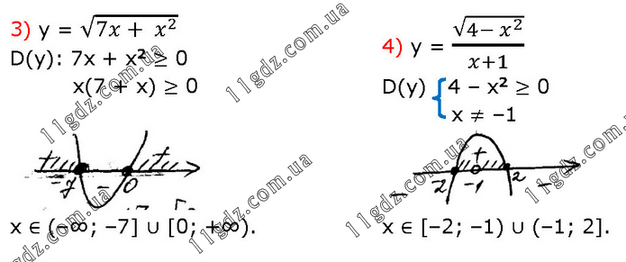 3) y = √(7x+ x^2 ) D(y): 7x + x2 ≥ 0 x(7 + x) ≥ 0 4) y = √(4- x^2 )/(x+1) D(y) 4 – x2 ≥ 0 x ≠ –1 x ∈ (–∞; –7] ∪ [0; +∞). x ∈ [–2; –1) ∪ (–1; 2].