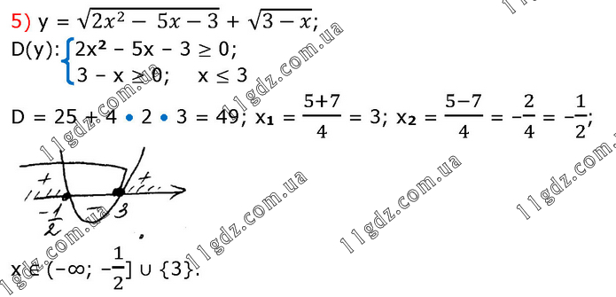 5) y = √(2x^2- 5x-3) + √(3-x); D(y): 2x2 – 5x – 3 ≥ 0; 3 – x ≥ 0; x ≤ 3 D = 25 + 4 • 2 • 3 = 49; x1 = (5+7)/4 = 3; x2 = (5-7)/4 = –2/4 = –1/2; x ∈ (–∞; –1/2] ∪ {3}.