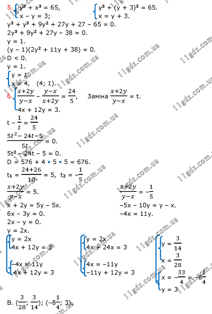 5. y3 + x3 = 65, x – y = 3; y3 + (y + 3)3 = 65. x = y + 3. y3 + y3 + 9y2 + 27y + 27 – 65 = 0. 2y3 + 9y2 + 27y – 38 = 0. y = 1. (y – 1)(2y2 + 11y + 38) = 0. D < 0. y = 1. y = 1. x = 4, (4; 1). 6. (x+2y)/(y-x) – (y-x)/(x+2y) = 24/5, 4x + 12y = 3. Заміна (x+2y)/(y-x) = t. t – 1/t = 24/5 (5t^2- 24t-5)/5t = 0. 5t2 – 24t – 5 = 0. D = 576 + 4 • 5 • 5 = 676. t1 = (24+26)/10 = 5, t2 = –1/5 (x+2y)/(y-x) = 5. x + 2y = 5y – 5x. 6x – 3y = 0. 2x – y = 0. y = 2x. (x+2y)/(y-x) = –1/5 –5x – 10y = y – x. –4x = 11y. y = 2x 4x + 12y = 3 –4x = 11y 4x + 12y = 3 y = 2x 4x + 24x = 3 4x = –11y –11y + 12y = 3 y = 3/14 x = 3/28 x = –33/4 = –81/4 y = 3 B. (3/28; 3/14); (–81/4; 3).