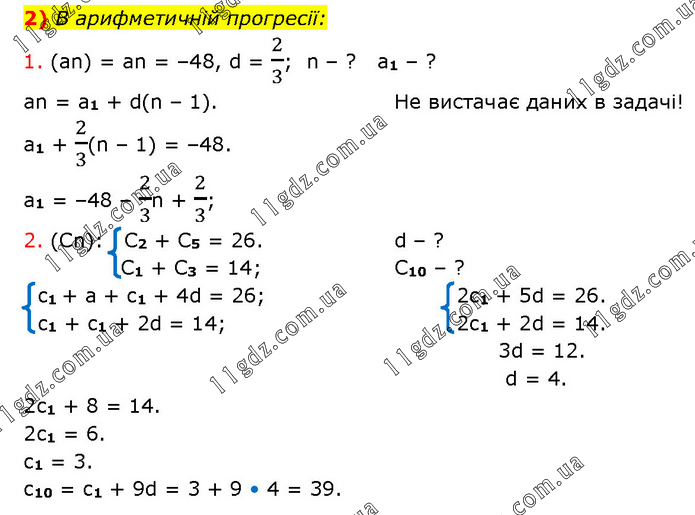 В арифметичній прогресії: 1. (an) = an = –48, d = 2/3; n – ? a1 – ? an = a1 + d(n – 1). a1 + 2/3(n – 1) = –48. a1 = –48 – 2/3n + 2/3; Не вистачає даних в задачі! 2. (Cn): C2 + C5 = 26. C1 + C3 = 14; d – ? C10 – ? c1 + a + c1 + 4d = 26; c1 + c1 + 2d = 14; 2c1 + 5d = 26. 2c1 + 2d = 14. 3d = 12. d = 4. 2c1 + 8 = 14. 2c1 = 6. c1 = 3. c10 = c1 + 9d = 3 + 9 • 4 = 39.