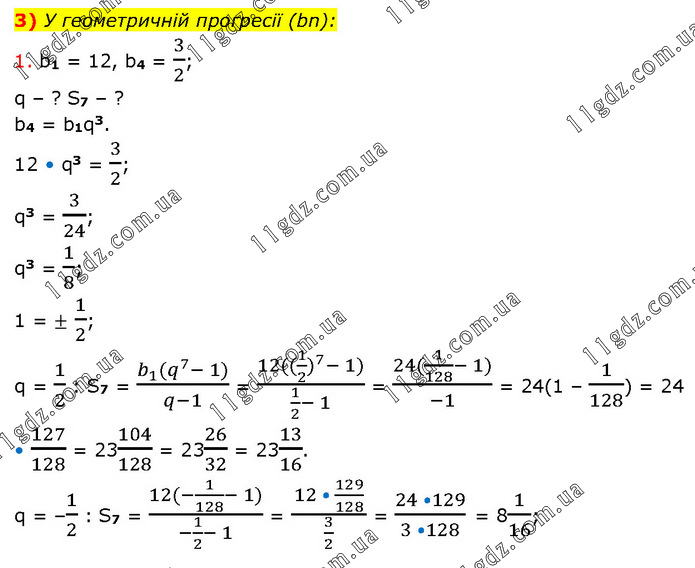 3) У геометричній прогресії (bn): 1. b1 = 12, b4 = 3/2; q – ? S7 – ? b4 = b1q3. 12 • q3 = 3/2; q3 = 3/24; q3 = 1/8; 1 = ± 1/2; q = 1/2 : S7 = (b_1 (q^7- 1))/(q-1) = (12((1/2 )^7- 1))/(1/2- 1) = (24(1/128- 1))/(-1) = 24(1 – 1/128) = 24 • 127/128 = 23104/128 = 2326/32 = 2313/16. q = –1/2 : S7 = (12(-1/128- 1))/(-1/2- 1) = (12 • 129/128)/(3/2) = (24 •129)/(3 •128) = 81/16;