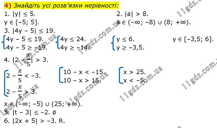 Знайдіть усі розв’язки нерівності: 1. |y| ≤ 5. y ∈ [–5; 5]. 2. |a| > 8. a ∈ (–∞; –8) ∪ (8; +∞). 3. |4y – 5| ≤ 19. 4y – 5 ≤ 19. 4y – 5 ≥ –19. 4y ≤ 24. 4y ≥ –14. y ≤ 6. y ≥ –3,5. y ∈ [–3,5; 6]. 4. |2 – x/5| > 3. 2 – x/5 < –3. 2 – x/5 > 3. 10 – x < –15. 10 – x > 15. x > 25. x < –5. x ∈ (–∞; –5) ∪ (25; +∞). 5. |t – 3| ≤ –2. ∅ 6. |2x + 5| > –3. R.