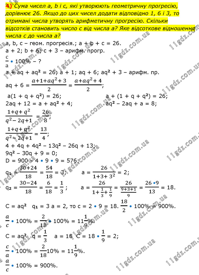 Сума чисел a, b і c, які утворюють геометричну прогресію, дорівнює 26. Якщо до цих чисел додати відповідно 1, 6 і 3, то отримані числа утворять арифметичну прогресію. Скільки відсотків становить число c від числа a? Яке відсоткове відношення числа c до числа a? a, b, c – геом. прогресія.; a + b + c = 26. a + 2; b + 6; c + 3 – арифм. прогр. с/а • 100% – ? a + aq + aq2 = 26; a + 1; aq + 6; aq2 + 3 – арифм. пр. aq + 6 = (a+1+aq^2+ 3)/2 = (a+aq^2+ 4)/2; a(1 + q + q2) = 26; 2aq + 12 = a + aq2 + 4; a + (1 + q + q2) = 26; aq2 – 2aq + a = 8; (1+q+ q^2)/(q^2- 2q+1) = 26/8; (1+q+ q^2)/(q^2- 2q+1) = 13/4; 4 + 4q + 4q2 – 13q2 – 26q + 13; 9q2 – 30q + 9 = 0; D = 900 – 4 • 9 • 9 = 576; q1 = (30+24)/18 = 54/18 = 3; a = 26/(1+3+ 3^2 ) = 2; q2 = (30-24)/18 = 6/18 = 1/3 ; a = 26/(1+ 1/3+ 1/9) = 26/((9+3+1)/9) = (26 •9)/13 = 18. C = aq2 q1 = 3 a = 2, то c = 2 • 9 = 18. 18/2 • 100% = 900%. a/c • 100% = 2/18 • 100% = 111/9%. C = aq2 q = 1/3 a = 18 C = 18 • 1/9 = 2; c/a • 100% = 2/1810% = 111/9%. a/c • 100% = 900%.