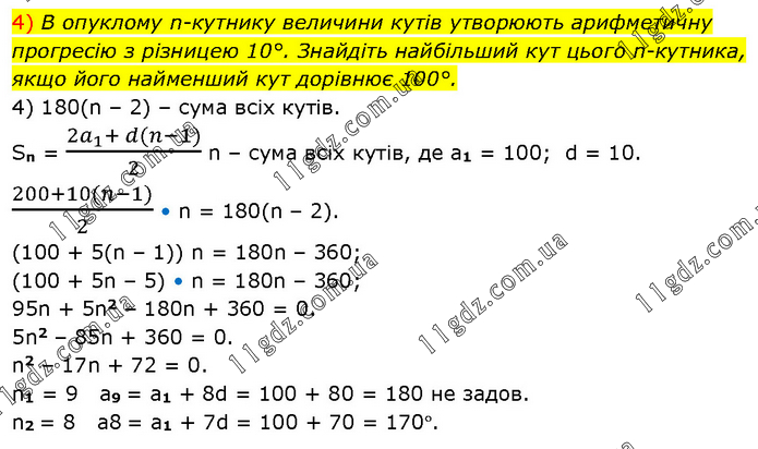 В опуклому n-кутнику величини кутів утворюють арифметичну прогресію з різницею 10°. Знайдіть найбільший кут цього n-кутника, якщо його найменший кут дорівнює 100°. 4) 180(n – 2) – сума всіх кутів. Sn = (2a_1+ d(n-1))/2 n – сума всіх кутів, де а1 = 100; d = 10. (200+10(n-1))/2 • n = 180(n – 2). (100 + 5(n – 1)) n = 180n – 360; (100 + 5n – 5) • n = 180n – 360; 95n + 5n2 – 180n + 360 = 0. 5n2 – 85n + 360 = 0. n2 – 17n + 72 = 0. n1 = 9 a9 = a1 + 8d = 100 + 80 = 180 не задов. n2 = 8 a8 = a1 + 7d = 100 + 70 = 170°.