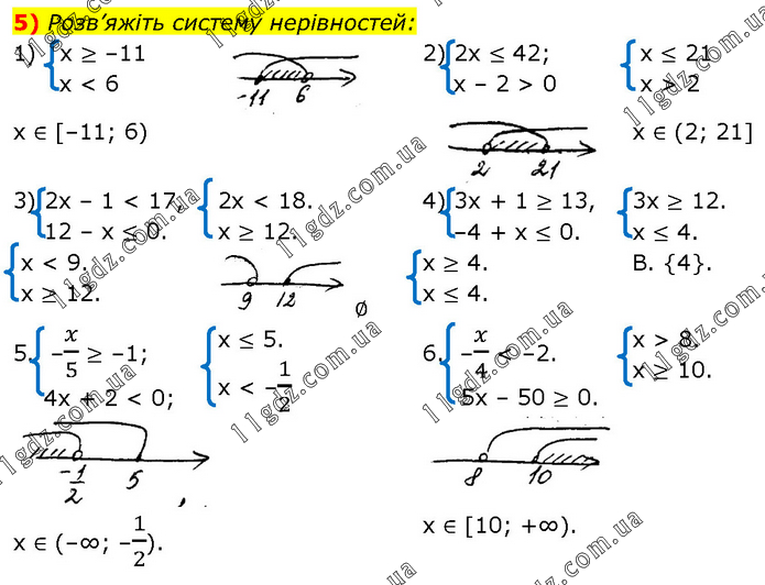 Розв’яжіть систему нерівностей: 1) x ≥ –11 x < 6 2) 2x ≤ 42; x – 2 > 0 x ≤ 21 x > 2 x ∈ [–11; 6) x ∈ (2; 21] 3) 2x – 1 < 17, 12 – x ≤ 0. 2x < 18. x ≥ 12. 4) 3x + 1 ≥ 13, –4 + x ≤ 0. 3x ≥ 12. x ≤ 4. x < 9. x ≥ 12. ∅ x ≥ 4. x ≤ 4. B. {4}. 5. –x/5 ≥ –1; 4x + 2 < 0; x ≤ 5. x < –1/2 6. –x/4 < –2. 5x – 50 ≥ 0. x > 8. x ≥ 10. x ∈ (–∞; –1/2). x ∈ [10; +∞).