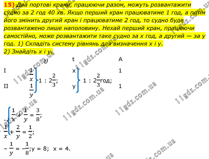 Два портові крани, працюючи разом, можуть розвантажити судно за 2 год 40 хв. Якщо перший кран працюватиме 1 год, а потім його змінить другий кран і працюватиме 2 год, то судно буде розвантажено лише наполовину. Нехай перший кран, працюючи самостійно, може розвантажити таке судно за x год, а другий — за y год. 1) Складіть систему рівнянь для визначення x і y. 2) Знайдіть x і y. 1/х + 1/y = 3/8; 1/x + 2/y = 1/2; – 1/y = –1/8;y = 8; x = 4.