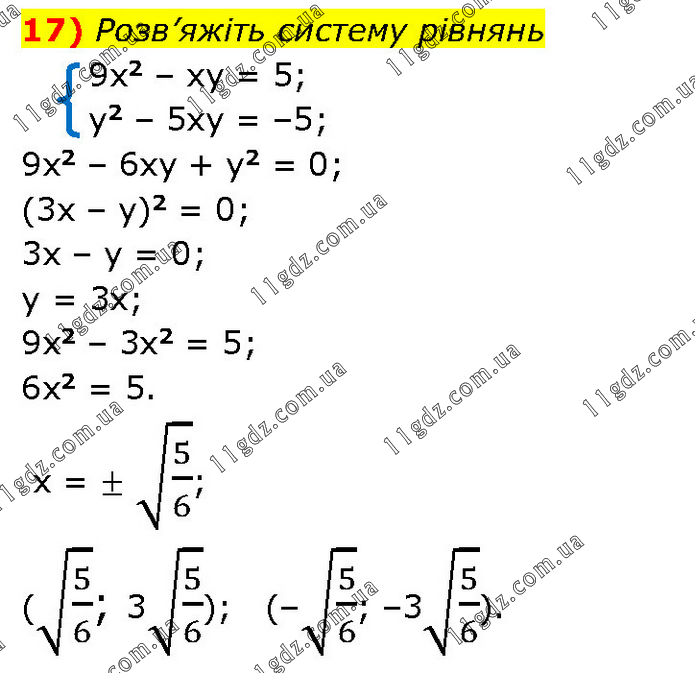 Розв’яжіть систему рівнянь 9x2 – xy = 5; y2 – 5xy = –5; 9x2 – 6xy + y2 = 0; (3x – y)2 = 0; 3x – y = 0; y = 3x; 9x2 – 3x2 = 5; 6x2 = 5. x = ± √(5/6); (√(5/6); 3√(5/6)); (–√(5/6); –3√(5/6)).