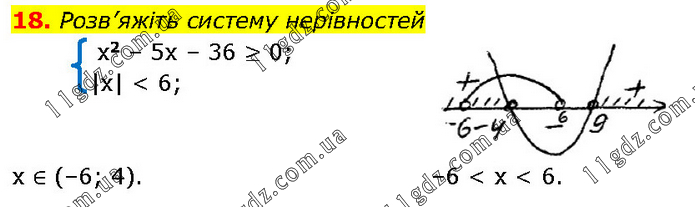 Розв’яжіть систему нерівностей x2 – 5x – 36 ≥ 0; |x| < 6; x ∈ (–6; 4). –6 < x < 6.