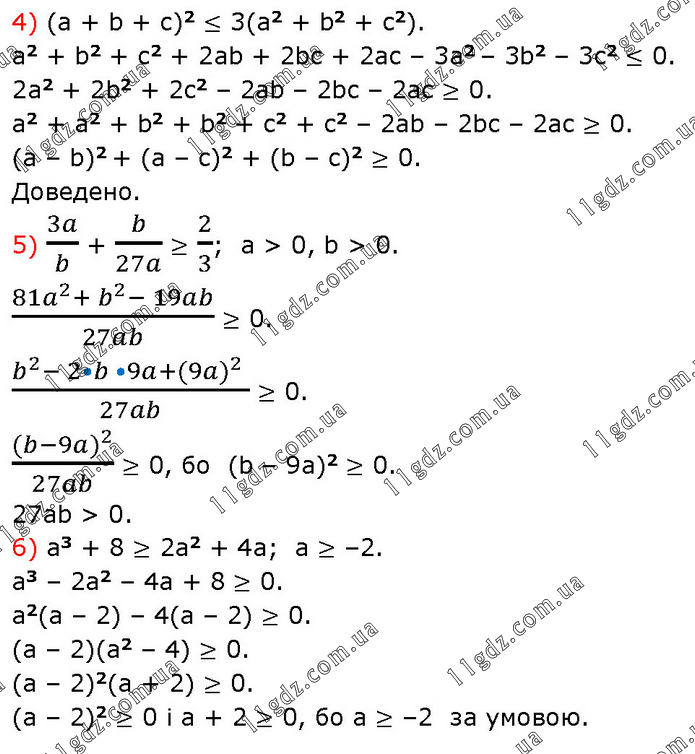 4) (a + b + c)2 ≤ 3(a2 + b2 + c2). a2 + b2 + c2 + 2ab + 2bc + 2ac – 3a2 – 3b2 – 3c2 ≤ 0. 2a2 + 2b2 + 2c2 – 2ab – 2bc – 2ac ≥ 0. a2 + a2 + b2 + b2 + c2 + c2 – 2ab – 2bc – 2ac ≥ 0. (a – b)2 + (a – c)2 + (b – c)2 ≥ 0. Доведено. 5) 3a/b + b/27a ≥ 2/3; a > 0, b > 0. (81a^2+ b^2- 19ab)/27ab ≥ 0. (b^2- 2•b •9a+(9a)^2 )/27ab ≥ 0. ((b-9a)^2)/27ab ≥ 0, бо (b – 9a)2 ≥ 0. 27ab > 0. 6) a3 + 8 ≥ 2a2 + 4a; a ≥ –2. a3 – 2a2 – 4a + 8 ≥ 0. a2(a – 2) – 4(a – 2) ≥ 0. (a – 2)(a2 – 4) ≥ 0. (a – 2)2(a + 2) ≥ 0. (a – 2)2 ≥ 0 i a + 2 ≥ 0, бо а ≥ –2 за умовою.