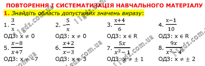 Знайдіть область допустимих значень виразу: 1. 3/х 2. –5/х 3. (х+4)/6 4. (х-1)/10 ОДЗ: х ≠ 0 ОДЗ: х ≠ 0 ОДЗ: х ∈ R ОДЗ: x ∈ R 5. (x-8)/(x+7) 6. (x+2)/(x-3) 7. 5x/(x^2- 1) 8. 9x/(x^2- 4) ОДЗ: х ≠ –7 ОДЗ: х ≠ 3 ОДЗ: x ≠ ± 1 ОДЗ: x ≠ ± 2