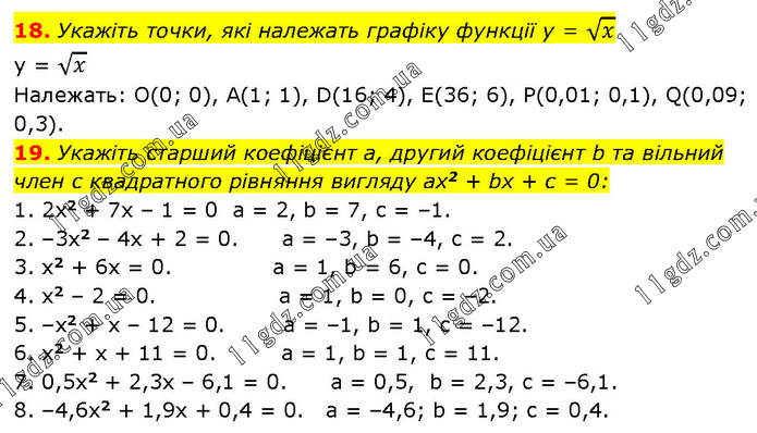 18. Укажіть точки, які належать графіку функції y = √x y = √x Належать: O(0; 0), A(1; 1), D(16; 4), E(36; 6), P(0,01; 0,1), Q(0,09; 0,3). 19. Укажіть старший коефіцієнт a, другий коефіцієнт b та вільний член c квадратного рівняння вигляду ax2 + bx + c = 0: 1. 2x2 + 7x – 1 = 0 a = 2, b = 7, c = –1. 2. –3x2 – 4x + 2 = 0. a = –3, b = –4, c = 2. 3. x2 + 6x = 0. a = 1, b = 6, c = 0. 4. x2 – 2 = 0. a = 1, b = 0, c = –2. 5. –x2 + x – 12 = 0. a = –1, b = 1, c = –12. 6. x2 + x + 11 = 0. a = 1, b = 1, c = 11. 7. 0,5x2 + 2,3x – 6,1 = 0. a = 0,5, b = 2,3, c = –6,1. 8. –4,6x2 + 1,9x + 0,4 = 0. a = –4,6; b = 1,9; c = 0,4.