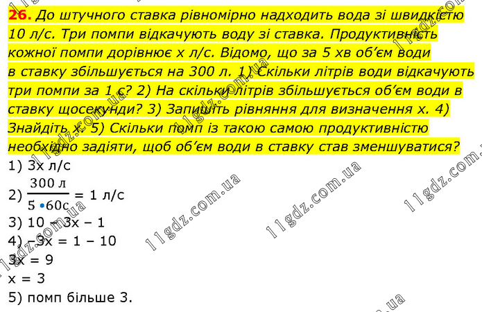 До штучного ставка рівномірно надходить вода зі швидкістю 10 л/с. Три помпи відкачують воду зі ставка. Продуктивність кожної помпи дорівнює x л/с. Відомо, що за 5 хв об’єм води в ставку збільшується на 300 л. 1) Скільки літрів води відкачують три помпи за 1 с? 2) На скільки літрів збільшується об’єм води в ставку щосекунди? 3) Запишіть рівняння для визначення x. 4) Знайдіть x. 5) Скільки помп із такою самою продуктивністю необхідно задіяти, щоб об’єм води в ставку став зменшуватися? 1) 3х л/с 2) (300 л)/(5 •60с) = 1 л/с 3) 10 – 3х – 1 4) –3х = 1 – 10 3х = 9 х = 3 5) помп більше 3.