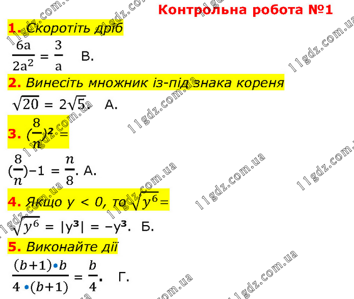 1. Скоротіть дріб 6а/(2а^2 ) = 3/а В. 2. Винесіть множник із-під знака кореня √20 = 2√5. А. 3. (8/n)2 = (8/n)–1 = n/8. A. 4. Якщо y < 0, то √(y^6 )= √(y^6 ) = |y3| = –y3. Б. 5. Виконайте дії ((b+1)•b)/(4 •(b+1)) = b/4. Г.