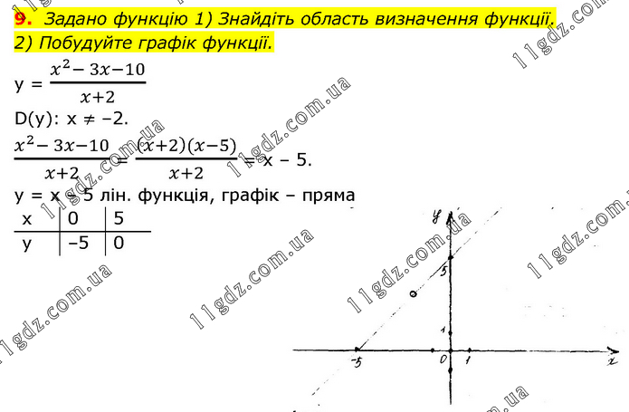 Задано функцію 1) Знайдіть область визначення функції. 2) Побудуйте графік функції. y = (x^2- 3x-10)/(x+2) D(y): x ≠ –2. (x^2- 3x-10)/(x+2) = ((x+2)(x-5))/(x+2) = x – 5. y = x – 5 лін. функція, графік – пряма