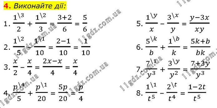 Виконайте дії: 1. 1^(\3)/2 + 1^(\2)/3 = (3+2)/6 = 5/6 5. 1^(\y)/x – 3^(\x)/y = (y-3x)/xy 2. 1^(\2)/5 – 1^(\1)/10 = (2-1)/10 = 1/10 6. 5^(\k)/b + 1^(\b)/k = (5k+b)/bk 3. x/2 – x/4 = (2x-x)/4 = x/4 7. 7^(\1)/y^3 + 3^(\y)/y^2 = (7+3y)/y^3 4. p^(\4)/5 + p^(\1)/20 = 5p/20 = p/4 8. 1^(\1)/t^5 – 2^(\t)/t^4 = (1-2t)/t^5