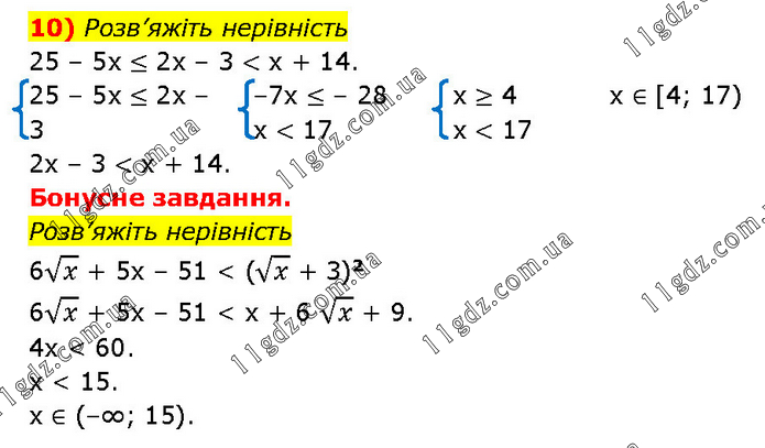 10) Розв’яжіть нерівність 25 – 5х ≤ 2х – 3 < х + 14. 25 – 5х ≤ 2х – 3 2х – 3 < х + 14. –7х ≤ – 28 х < 17 х ≥ 4 х < 17 х ∈ [4; 17) Бонусне завдання. Розв’яжіть нерівність 6√x + 5x – 51 < (√x + 3)2 6√x + 5x – 51 < x + 6 √x + 9. 4x < 60. x < 15. x ∈ (–∞; 15).
