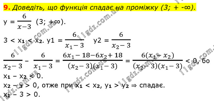 Доведіть, що функція спадає на проміжку (3; + ∞). y = 6/(x-3) (3; +∞). 3 < x1 < x2. y1 = 6/(x_1- 3) y2 = 6/(x_2- 3) 6/(x_2- 3) – 6/(x_1- 3) = (6x_1- 18-6x_2+ 18)/((x_2- 3)(x_1- 3)) = (6(x_1- x_2))/((x_2- 3)(x_1- 3)) < 0, бо x1 – x2 < 0. x2 – 3 > 0, отже при х1 < x2, y1 > y2 ⇒ спадає. x1 – 3 > 0.