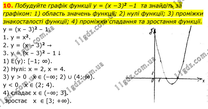 Побудуйте графік функції y = (x −3)2 −1 та знайдіть за графіком: 1) область значень функції; 2) нулі функції; 3) проміжки знакосталості функції; 4) проміжки спадання та зростання функції. у = (х – 3)2 – 1. 1. у = х2. 2. у = (х – 3)2 → 3. у = (х – 3)2 – 1 ↓ 1) Е(у): [–1; ∞). 2) Нулі: х = 2, х = 4. 3) у > 0 x ∈ (–∞; 2) ∪ (4; ∞). y < 0 x ∈ (2; 4). 4) спадає x ∈ (–∞; 3]. зростає x ∈ [3; +∞).