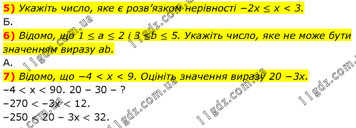 5) Укажіть число, яке є розв’язком нерівності −2¬x ≤ x < 3. Б. 6) Відомо, що 1¬ ≤ a ≤ 2 і 3 ≤¬b ¬≤ 5. Укажіть число, яке не може бути значенням виразу ab. А. 7) Відомо, що −4 < x < 9. Оцініть значення виразу 20 −3x. –4 < х < 90. 20 – 30 – ? –270 < –3х < 12. –250 < 20 – 3х < 32.