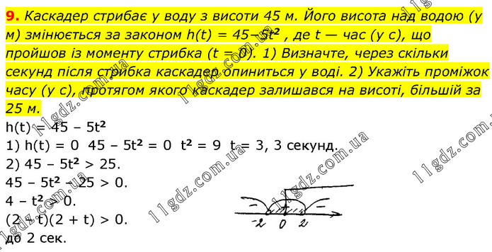 Каскадер стрибає у воду з висоти 45 м. Його висота над водою (у м) змінюється за законом h(t) = 45−5t2 , де t — час (у с), що пройшов із моменту стрибка (t = 0). 1) Визначте, через скільки секунд після стрибка каскадер опиниться у воді. 2) Укажіть проміжок часу (у с), протягом якого каскадер залишався на висоті, більшій за 25 м. h(t) = 45 – 5t2 1) h(t) = 0 45 – 5t2 = 0 t2 = 9 t = 3, 3 секунд. 2) 45 – 5t2 > 25. 45 – 5t2 – 25 > 0. 4 – t2 > 0. (2 – t)(2 + t) > 0. до 2 сек.