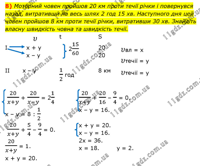 Моторний човен пройшов 20 км проти течії річки і повернувся назад, витративши на весь шлях 2 год 15 хв. Наступного дня цей човен пройшов 8 км проти течії річки, витративши 30 хв. Знайдіть власну швидкість човна та швидкість течії. υ t S I x + y x – y 20 20 υвл = х υтечії = у II х – у 1/2 год 8 км υтечії = у 20/(x+y) + 20/(x-y) = 21/4 x – y = 8 : 1/2 20/(x+y) + 20/16 – 9/4 = 0. x – y = 16. 20/(x+y) + 5/4 – 9/4 = 0. 20/(x+y) = 1. x + y = 20. x + y = 20. x – y = 16. 2x = 36. x = 18. y = 2.