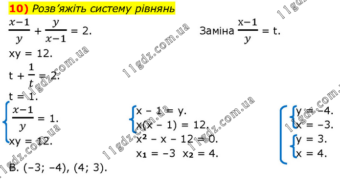 Розв’яжіть систему рівнянь (x-1)/y + y/(x-1) = 2. xy = 12. t + 1/t = 2. t = 1. Заміна (х-1)/y = t. (x-1)/y = 1. xy = 12. x – 1 = y. x(x – 1) = 12. x2 – x – 12 = 0. x1 = –3 x2 = 4. y = –4. x = –3. y = 3. x = 4. B. (–3; –4), (4; 3).