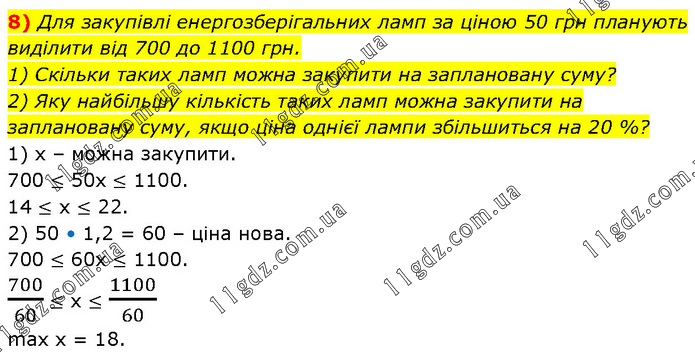 8) Для закупівлі енергозберігальних ламп за ціною 50 грн планують виділити від 700 до 1100 грн. 1) Скільки таких ламп можна закупити на заплановану суму? 2) Яку найбільшу кількість таких ламп можна закупити на заплановану суму, якщо ціна однієї лампи збільшиться на 20 %? 1) х – можна закупити. 700 ≤ 50х ≤ 1100. 14 ≤ х ≤ 22. 2) 50 • 1,2 = 60 – ціна нова. 700 ≤ 60х ≤ 1100. 700/60 ≤ х ≤ 1100/60 max x = 18.