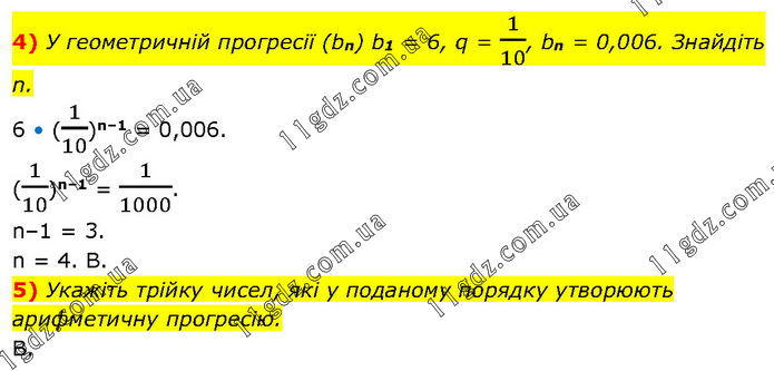 4) У геометричній прогресії (bn) b1 = 6, q = 1/10, bn = 0,006. Знайдіть n. 6 • (1/10)n–1 = 0,006. (1/10)n–1 = 1/1000. n–1 = 3. n = 4. B. 5) Укажіть трійку чисел, які у поданому порядку утворюють арифметичну прогресію. B.