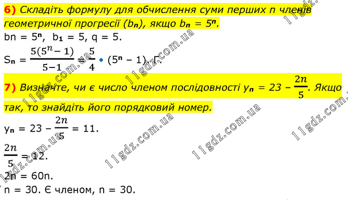 6) Складіть формулу для обчислення суми перших n членів геометричної прогресії (bn), якщо bn = 5n. bn = 5n, b1 = 5, q = 5. Sn = (5(5^n- 1))/(5-1) = 5/4 • (5n – 1). Г. 7) Визначте, чи є число членом послідовності yn = 23 – 2n/5. Якщо так, то знайдіть його порядковий номер. yn = 23 – 2n/5 = 11. 2n/5 = 12. 2n = 60n. n = 30. Є членом, n = 30.