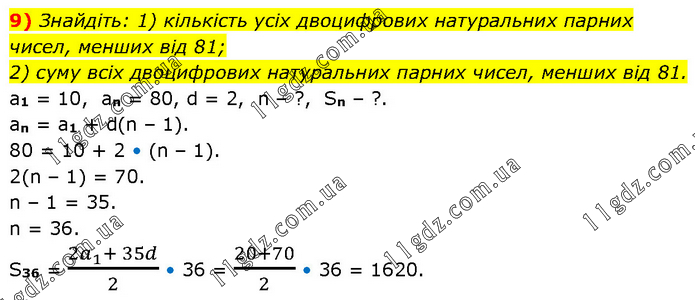 Знайдіть: 1) кількість усіх двоцифрових натуральних парних чисел, менших від 81; 2) суму всіх двоцифрових натуральних парних чисел, менших від 81. a1 = 10, an = 80, d = 2, n – ?, Sn – ?. an = a1 + d(n – 1). 80 = 10 + 2 • (n – 1). 2(n – 1) = 70. n – 1 = 35. n = 36. S36 = (2a_1+ 35d)/2 • 36 = (20+70)/2 • 36 = 1620.