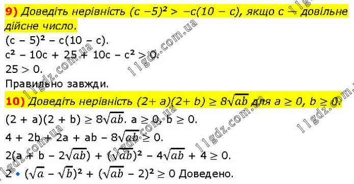 9) Доведіть нерівність (c −5)2 > −c(10 − c), якщо с — довільне дійсне число. (c – 5)2 – c(10 – c). c2 – 10c + 25 + 10c – c2 > 0. 25 > 0. Правильно завжди. 10) Доведіть нерівність (2+ a)(2+ b) ≥ 8√ab для a ≥ 0, b ≥ 0. (2 + а)(2 + b) ≥ 8√ab. a ≥ 0, b ≥ 0. 4 + 2b + 2a + ab – 8√ab ≥ 0. 2(a + b – 2√ab) + (√ab)2 – 4√ab + 4 ≥ 0. 2 • (√a – √b)2 + (√ab – 2)2 ≥ 0 Доведено.