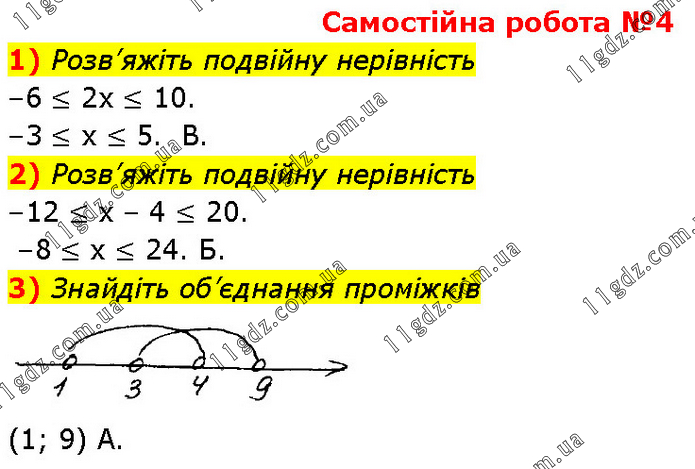 Самостійна робота №4 1) Розв’яжіть подвійну нерівність –6 ≤ 2х ≤ 10. –3 ≤ х ≤ 5. В. 2) Розв’яжіть подвійну нерівність –12 ≤ х – 4 ≤ 20. –8 ≤ х ≤ 24. Б. 3) Знайдіть об’єднання проміжків (1; 9) А.