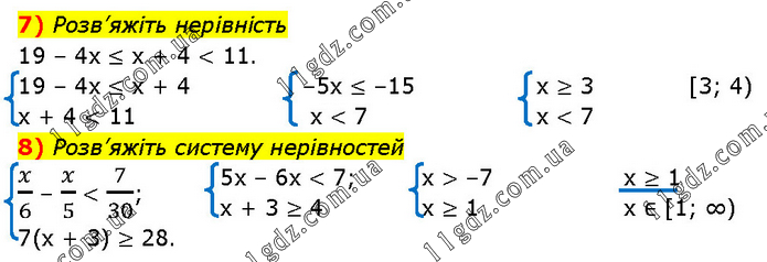 7) Розв’яжіть нерівність 19 – 4х ≤ х + 4 < 11. 19 – 4х ≤ х + 4 х + 4 < 11 –5х ≤ –15 х < 7 х ≥ 3 х < 7 [3; 4) 8) Розв’яжіть систему нерівностей x/6 – x/5 < 7/30; 7(x + 3) ≥ 28. 5x – 6x < 7; x + 3 ≥ 4 x > –7 x ≥ 1 x ≥ 1 x ∈ [1; ∞)