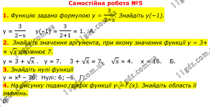 Самостійна робота №5 1. Функцію задано формулою у = 3/(2-х). Знайдіть y(−1). у = 3/(2-х) у(–1) = 3/(2+1) = 1. А. 2. Знайдіть значення аргумента, при якому значення функції y = 3+ + √х дорівнює 7. у = 3 + √х . у = 7. 3 + √х = 7. √х = 4. х = 16. Б. 3. Знайдіть нулі функції у = х2 – 36. Нулі: 6; –6. Г. 4. На рисунку подано графік функції y = f (x). Знайдіть область її значень. В.