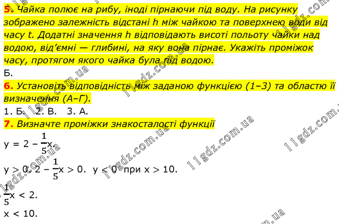 5. Чайка полює на рибу, іноді пірнаючи під воду. На рисунку зображено залежність відстані h між чайкою та поверхнею води від часу t. Додатні значення h відповідають висоті польоту чайки над водою, від’ємні — глибині, на яку вона пірнає. Укажіть проміжок часу, протягом якого чайка була під водою. Б. 6. Установіть відповідність між заданою функцією (1–3) та областю її визначення (А–Г). 1. Б. 2. В. 3. А. 7. Визначте проміжки знакосталості функції у = 2 – 1/5х. у > 0. 2 – 1/5х > 0. у < 0 при х > 10. 1/5х < 2. x < 10.