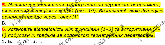 5. Машина для вишивання запрограмована відтворювати орнамент, визначений функцією y = f (x) (рис. 19). Визначений якою функцією орнамент пройде через точку М? В. 6. Установіть відповідність між функціями (1–3) та алгоритмами (А–Г) побудови їх графіків за допомогою геометричних перетворень. 1. Б. 2. А. 3. Г.