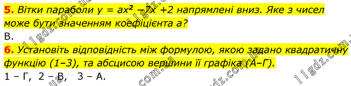 5. Вітки параболи y = ax2 −7x +2 напрямлені вниз. Яке з чисел може бути значенням коефіцієнта a? В. 6. Установіть відповідність між формулою, якою задано квадратичну функцію (1–3), та абсцисою вершини її графіка (А–Г). 1 – Г, 2 – В, 3 – А.