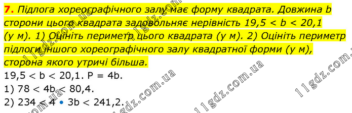 Підлога хореографічного залу має форму квадрата. Довжина b сторони цього квадрата задовольняє нерівність 19,5 < b < 20,1 (у м). 1) Оцініть периметр цього квадрата (у м). 2) Оцініть периметр підлоги іншого хореографічного залу квадратної форми (у м), сторона якого утричі більша. 19,5 < b < 20,1. P = 4b. 1) 78 < 4b < 80,4. 2) 234 < 4 • 3b < 241,2.