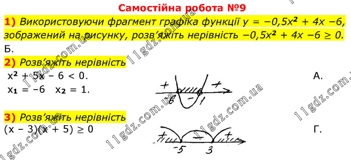 Самостійна робота №9 1) Використовуючи фрагмент графіка функції y = −0,5x2 + 4x −6, зображений на рисунку, розв’яжіть нерівність −0,5x2 + 4x −6¬ ≥ 0. Б. 2) Розв’яжіть нерівність х2 + 5х – 6 < 0. x1 = –6 x2 = 1. A. 3) Розв’яжіть нерівність (x – 3)(x + 5) ≥ 0 Г.