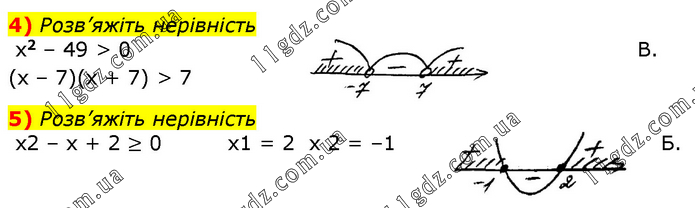 4) Розв’яжіть нерівність x2 – 49 > 0 (x – 7)(x + 7) > 7 B. 5) Розв’яжіть нерівність x2 – x + 2 ≥ 0 x1 = 2 x 2 = –1 Б.