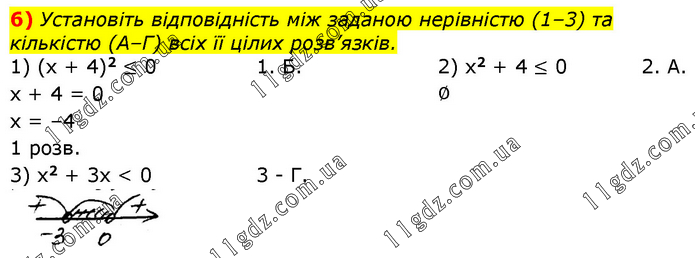 6) Установіть відповідність між заданою нерівністю (1–3) та кількістю (А–Г) всіх її цілих розв’язків. 1) (х + 4)2 ≤ 0 х + 4 = 0 х = –4 1 розв. 1. Б. 2) х2 + 4 ≤ 0 ∅ 2. А. 3) х2 + 3х < 0 3 - Г.