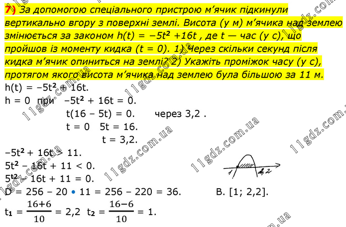 За допомогою спеціального пристрою м’ячик підкинули вертикально вгору з поверхні землі. Висота (у м) м’ячика над землею змінюється за законом h(t) = −5t2 +16t , де t — час (у с), що пройшов із моменту кидка (t = 0). 1) Через скільки секунд після кидка м’ячик опиниться на землі? 2) Укажіть проміжок часу (у с), протягом якого висота м’ячика над землею була більшою за 11 м. h(t) = –5t2 + 16t. h = 0 при –5t2 + 16t = 0. t(16 – 5t) = 0. через 3,2 . t = 0 5t = 16. t = 3,2. –5t2 + 16t > 11. 5t2 – 16t + 11 < 0. 5t2 – 16t + 11 = 0. D = 256 – 20 • 11 = 256 – 220 = 36. t1 = (16+6)/10 = 2,2 t2 = (16-6)/10 = 1. B. [1; 2,2].