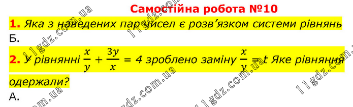 Самостійна робота №10 1. Яка з наведених пар чисел є розв’язком системи рівнянь Б. 2. У рівнянні x/y + 3y/x = 4 зроблено заміну x/y = t Яке рівняння одержали? А.
